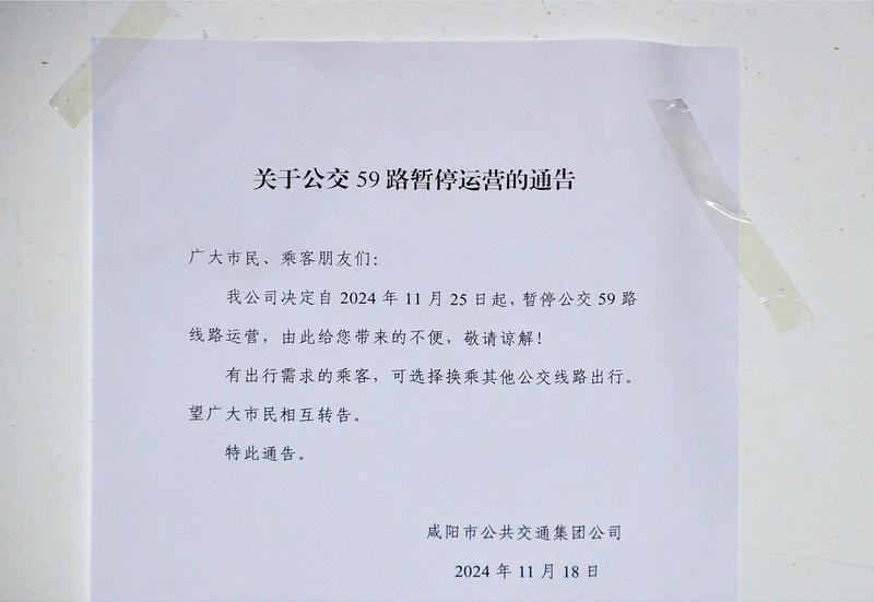 提起59路公交车,它曾经是西安到咸阳两地公交通勤的主要交通路线,62个年头,跨越了几代人,也是不少西安咸阳人的共同回忆。近日,59路沿线所有公交站点张贴公告,宣布将于11月25日暂停运营,请乘客换乘其他公交线路。