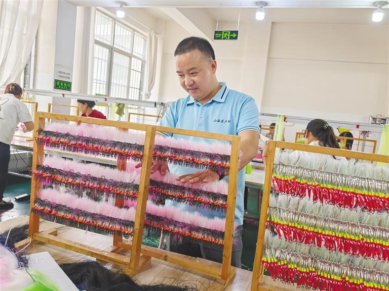 工厂负责人谭庆宏拿起一枚缠着绿丝线的鱼钩,越看越满意:“彩线缠得密,辫子扎得结实,一个线头都没有。”