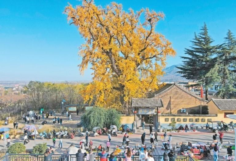 初冬暖阳里的长安区百塔寺古刹内,那棵植于西晋太康年间的银杏进入最佳观赏期。三十余米高的树干上,叶片缀满枝头如覆“金箔”。11月30日,树旁村民摊贩云集成市,大批游人举着手机定格美景。烟火气与古意交融,静静诉说着这棵古树1700余年的沧桑岁月。