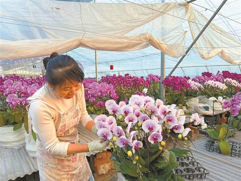 蝴蝶兰示范基地负责人白苗苗戴上手套,检查即将远行的“宝贝”。她精心照料的4000株蝴蝶兰将被运往海南,为春节增添喜庆色彩。