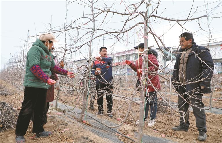 姚明强(右三)在苹果示范园指导村民进行冬季果树修剪。 本报通讯员 田亚南摄