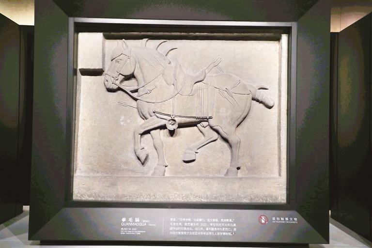 近日,记者在西安碑林博物馆北区场馆的“骧腾百世——昭陵六骏专题展”上看到,昭陵六骏石刻静静伫立,超越时光的文化生命力和艺术感染力扑面而来。昭陵六骏共六块石屏,一屏一马,每块石屏高171厘米,宽205厘米,厚30厘米,原置于昭陵后山祭坛寝殿前的白石台基上,后世整修时移至东西两庑。西侧依次是飒露紫、拳毛騧、白蹄乌,东侧依次是特勤骠(也称特勒骠)、青骓、什伐赤。其中,“飒露紫”和“拳毛騧”两石刻在1914年时被盗,辗转于文物商之手,最后流失海外,后入藏美国宾夕法尼亚大学博物馆。其余四块也曾被打碎装箱,盗运时被截获,现陈列在西安碑林博物馆。