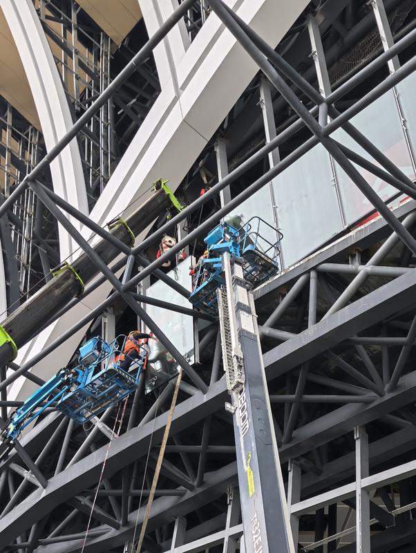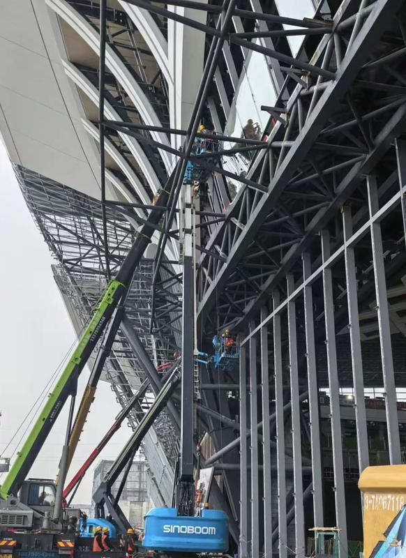 “安装难度极大,玻璃又都是异形的,每一块都要反复校准,我们班组20多个人,春节期间一天最多能装四五块。”杨兴福介绍,为保证每块玻璃精准安装,中铁建设项目团队应用三维建模及北斗高清全站仪,在玻璃安装前进行建模确定点位。